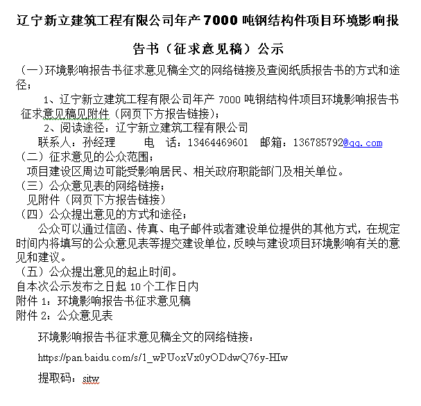 遼寧新立建筑工程有限公司年產(chǎn)7000噸鋼結(jié)構(gòu)件項目環(huán)境影響報告書(征求意見稿)公示
